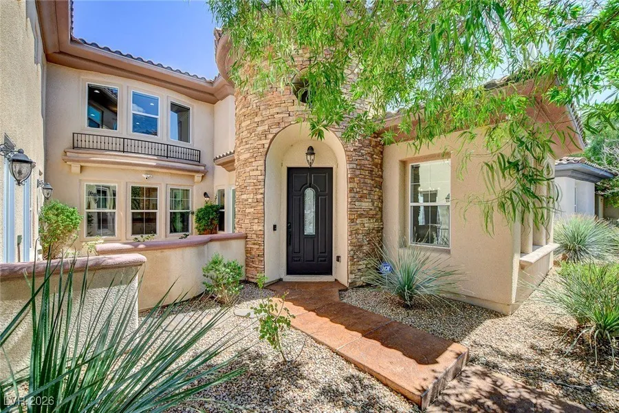 **CHECK OUT VIRTUAL TOUR** Experience luxury living in prestigious Paseos of Summerlin! 5-bedroom estate w/private casita blends timeless design and breathtaking views. Enter through the foyer into a formal living & dining areas, w/a versatile front room ideal for a den or library. A stylish wet bar connects the spaces, while the gourmet kitchen features a large island, stainless appliances, and custom cabinetry. The family room is filled w/natural light & anchored by a designer chandelier, and a flex room is perfect for a gym or game room. The primary suite offers dual vanities & water closets, custom closets, a walk-through shower, soaking tub & a private balcony w/panoramic mountain & Strip views. A downstairs en-suite bedroom & attached casita provide comfort for guests or multi-gen living, w/the front courtyard creating private access & additional outdoor space. Outside, enjoy the sparkling pool, spa, and expansive patio—ideal for entertaining under the desert sky.