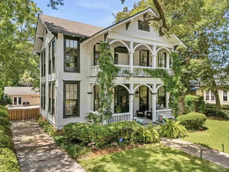 Rich heritage abounds in this extraordinary Victorian estate. Rebuilt on its current site, using elements from Pensacola’s first schoolhouse, this grand two-story property is a testament to timeless design, classic craftsmanship, and meticulous stewardship. Spanning over 2,600 square feet on a generously sized 0.33-acre lot, the home features four spacious bedrooms, two refined bathrooms, and a layout that flows with both grace and purpose. Towering 11-foot ceilings and stately 9-foot windows allow natural light to pour into each room, illuminating the warmth of original heart pine flooring, intricate moldings, and 9-inch baseboards. Period charm abounds in every room—from the grand dining space to the expansive living area and intimate first-floor secretary’s nook. The kitchen and bathrooms have been thoughtfully remodeled over the years, blending historic elegance with updated finishes and convenience. Modern upgrades include new electrical wiring, two recently replaced HVAC systems, a tankless water heater, and a brand-new roof installed Sept 2025—ensuring the comforts of today remain at the forefront. Outside, the magic continues. Twin porches—one on each floor—capture gentle breezes and offer front-row views of majestic heritage oaks. A 35’x 23’ brick patio, winding garden paths, and charming brick walkways invite you to entertain or unwind in a lush, private setting. The beautifully-landscaped yard includes a detached, oversized two-car garage, a fully heated and cooled bonus studio ideal for an artist’s retreat or office, and a powered garden shed perfect for additional storage for your passions and projects. Located in the heart of East Hill, you’re just minutes from vibrant downtown Pensacola, schools, local eateries, medical centers, and military bases. Rarely does a property of such historic significance, architectural grace, and thoughtful modernization come to market. This is more than a home—it’s a legacy waiting to be shared.