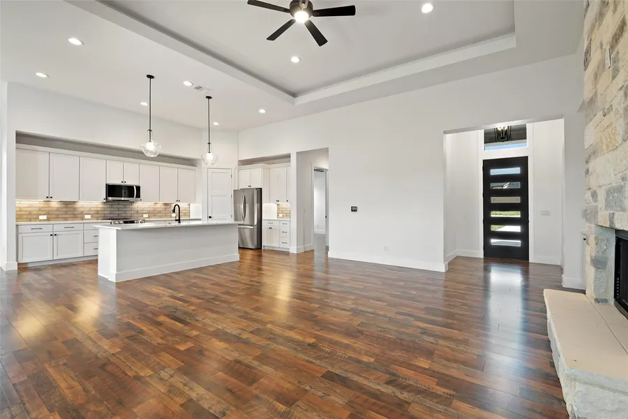Preferred Lender Incentive: Builder is offering a 2/1 Buydown when you use their preferred lender, Louis Balady of Town Square Mortgage. Rates are subject to change & buyer qualifying. Seller Credit for buydown is negotiable & must be written into the initial offer for consideration & approval. A modern farmhouse masterpiece by River Hutchinson Homes, nestled in the scenic beauty of Wimberley, this newly constructed 4 bed, 4 bath home showcases thoughtful, elevated design and timeless charm in one of the Hill Country's most beloved communities. Step inside to find warm Morant hickory wood floors that flow through an open-concept main living area. The inviting space features a stunning fireplace flanked by custom-built-ins. The chef-inspired kitchen boasts quartz countertops, stainless steel appliances, a center island, and a walk-in pantry. A bright and airy dining space offers a seamles...