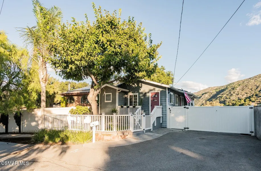 Be a part of the Santa Susana Knolls' history. Studio filming, Corriganville, Tarzan, Cowboys, Jurassic Park. nearby Corriganville has it for your hiking and touring pleasure as this home is just a couple minutes away. This 1928 absolutely charming cabin home is one of the original homes built in ''The Knolls,'' an ecelctic communty within the borders of East Simi Valley and the San Fernando Valley. You'll recognize the home by the mulberry tree in the front yard, artificial grass and the pretty red painted front door and where, in the Great Room, you'll find proudly displayed photos of the old Alta Vista Road, the old Railroad Station and The Santa Susana Pass Road. The original Knolls brochure of cabin sites being sold is in the home to be viewed.. 1088 Alta Vista has been completely remodeled with pine vaulted ceilings, kitchen with hickory cabinets, some pull-outs, bar stools included, double sink, gas cooktop, disposal, dishwasher and refrigerator included, finished with warmth that lends itself to entertaining friends and family. The Great Room concept provides lots of natural light, and gives you a setting of modern living or from the days of a weekend retreat set among oak trees, gorgeous peacocks that roam the streets and rooftops (check out the feathers in the Great Room). The spacious bedroom, with french doors to a private rear deck, has two double wardrobe closets with partial built-in cabinetry and views of the mountains that sooth the soul when enjoying the atmosphere of The Knolls and while you sip your coffee in the morning or wine in the evening. The bath also has been remodeled with Travertine flooring, stone counter and shower, floor to ceiling. Laminate flooring, vinyl blinds, utility room inside with washer/dryer hookups, ceiling fans and the mounted TV is included. Surround sound is a cleverly designed hidden floor compartment with integrated electrical outlets provide convenient power access while keeping cords and devices neatly out of sight. Oh, did I mention there's fully paid off solar here too! The side yard has been extended to accommodiate a trailer or other vehicle and room for other toys, behind gates for privacy. Easy care of the exterior with ''hardy'' siding. Below and underneath the main house is an anteroom, workshop or as is called ''The Den''. with electrical wiring and systems including surround sound wiring, workshop, storage and newer AC, ductwork and tankless water heater. Close to Corriganville, a public park, Santa Susana Railroad Depot and Museum, Old Santa Susana Cafe, delicous food and ambiance and other facilities to serve you. If you're seeking quiet, serenity, a place to create your works, The Knolls and this home is for you.