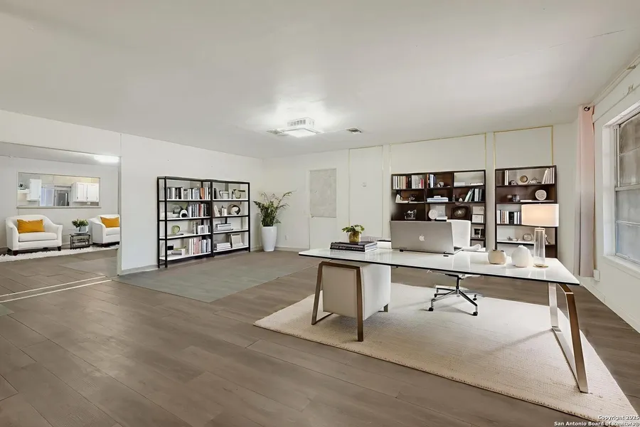 Great investment or fixer-upper opportunity! 3-bedroom, 2-full bath, 2-powder room home with an open-concept layout and multiple living areas, including a flex space perfect for an office or formal dining. Kitchen features stainless steel appliances and a refrigerator that will stay. The water heater was replaced in 2014. One-car garage with an extended covered driveway provides plenty of parking for multiple vehicles. Seller has indicated the oversized lot has been platted for the backyard area, allowing a future owner the potential to build an additional home or structure of approximately 1,035 sq. ft. (documentation pending; buyer to verify). Solar panels are fully paid off, offering energy savings from day one. SELLING AS IS, foundation and other repairs needed. Prime location near Lackland AFB, highways, schools, and shops. Seller is motivated and ready for a quick close.