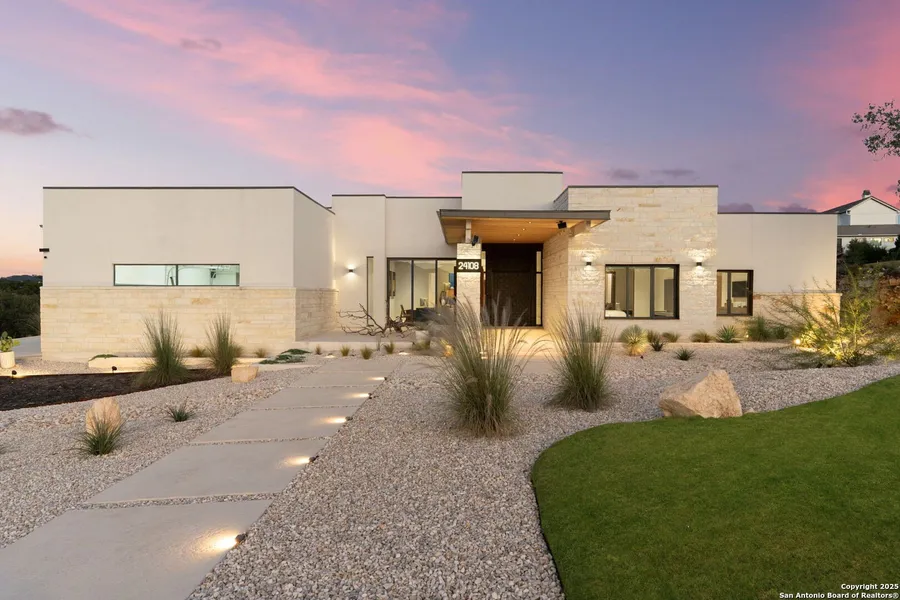 Welcome to a refined contemporary residence that perfectly blends modern elegance with timeless materials. Nestled on an elevated lot, this stunning home offers exceptional privacy and breathtaking extended views. From the moment you arrive, a private drive leads to a discreet side-entry three-car garage, setting the tone for the home's clean architectural lines, smooth stucco finish, and sophisticated limestone accents. Inside, the open-concept layout is flooded with natural light, thanks to soaring ceilings and expansive windows that frame every space. A striking natural wood-accented fireplace wall serves as the focal point of the living area, where large-format tile flooring flows seamlessly throughout. The chef-inspired kitchen is a true showpiece, anchored by a sleek granite island and enhanced with matte black and warm wood cabinetry, open shelving, and full-height pantry storage. Premium Thermador appliances include a commercial-style gas range, wall-mounted microwave, integrated refrigeration, and a convenient pot filler. A deep, modern sink with designer fixtures and under-cabinet lighting complete this high-performance space. Oversized sliding glass doors connect the main living areas to a covered outdoor patio-perfect for al fresco dining or relaxed entertaining. Framed by elegant stone columns and recessed lighting, the outdoor space is surrounded by thoughtfully landscaped grounds. The serene primary suite offers a generous layout and is thoughtfully designed for both comfort and flexibility. The spa-style en-suite bathroom is a private retreat, featuring a floating dual vanity, a freestanding soaking tub, and a frameless walk-in shower with a rainfall fixture, all wrapped in luxurious large-format tile. This home masterfully balances comfort, style, and functionality-delivering a lifestyle of understated luxury in one of San Antonio's most desirable neighborhoods.