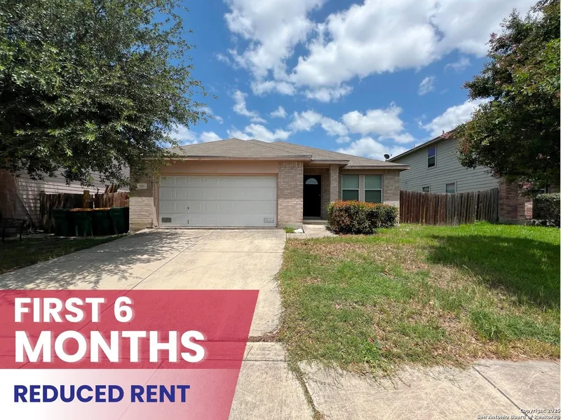 $1495 for the 1st 6 months, then $1595 per month. Single Story 3 Bed, 2 Bath, 1779 sq ft Home. No Carpets! All Wood-like Tile and Laminate Floors. Living Room, Dining Room combo. Kitchen with Granite Counters, Flat-top Stove, Dishwasher. Large 2nd Living Room. Primary Bedroom with Ceiling Fan, Walk-in Closet. Primary Bath with Dual Sinks, Shower/Garden Tub combo. Fenced Yard with Storage Shed. 2 Car Garage with Opener. Near Randolph AFB, 1604, I-35, Shopping.