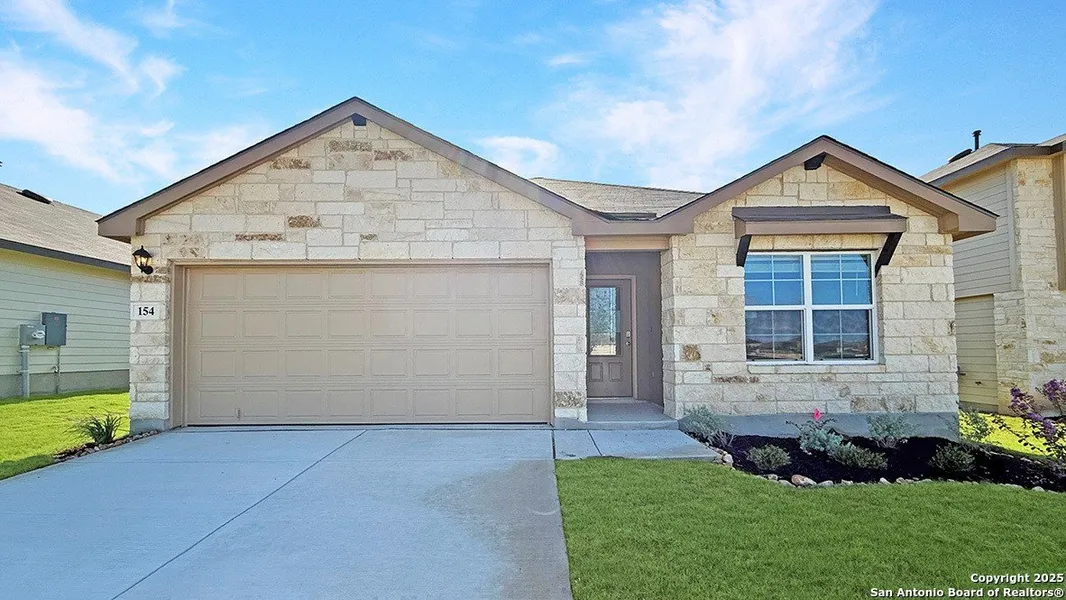 The Bryant is a stunning single-story home featured at Redbird Ranch in San Antonio, TX. The Bryant is sure to impress with its selection of 3 front exteriors, 4 bedrooms, 2 bathrooms and 2-car garage. Welcome guests as they walk through the elongated foyer with a decorative nook wall feature to the spacious eat-in kitchen. Facing the blended dining area and living room, the kitchen includes an oversized island, corner pantry with shelving, plenty of cabinet storage, quartz countertops, stylish subway tile backsplash, stainless steel appliances, and a gas cooking range. The private main bedroom is located at the back of the house and features a relaxing ensuite bathroom complete with double vanities, a garden tub, walk-in shower, and a spacious walk-in closet. If privacy is your top priority, this bathroom comes standard with a separate water closet. Two secondary bedrooms are located off the entry and the other is centrally located off the kitchen. All have quality carpet, spacious closets and windows for plenty of natural lighting. Whether these rooms become bedrooms or other bonus spaces, there is sure to be comfort and functionality. Additional features include tall 9-foot ceilings, 2-inch faux wood blinds throughout the home, luxury vinyl plank flooring in the entry, family room, kitchen, and dining area, ceramic tile in the bathrooms and utility room, and pre-plumb for water softener loop. Relax outside on a covered patio (per plan) located off the family room and enjoy full yard landscaping and full yard irrigation. You'll enjoy added security in your new home with our Home is Connected features. Using one central hub that talks to all the devices in your home, you can control the lights, thermostat and locks, all from your cellular device.