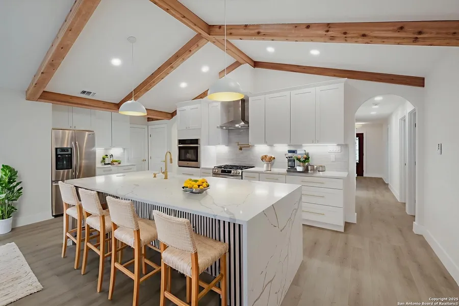 Picture pulling up to a home that finally got it right. Every inch has been rebuilt, refreshed, or reimagined-down to the studs-so you can skip the projects and slip straight into a turn-key lifestyle just ten minutes from the Medical Center. Step through the front door and into the formal spaces, where clean modern textures and thoughtfully chosen wall treatments set the tone. Light spills in through (some newly installed) windows, giving the home a warm, polished glow that feels immediately inviting. Move into the heart of the home and you'll find the showstopper: an open kitchen and living area crowned with a natural wood-beamed ceiling that steals the spotlight without trying. The island offers waterfall countertops, a generous breakfast bar, and just the right setup for effortless hosting. Gold hardware, gas cooking, stainless appliances, a pot filler-every detail was selected for b...