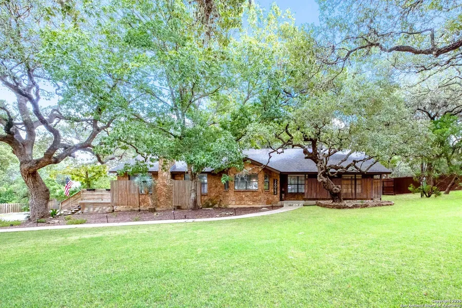 Nestled in the sought-after gated community of Scenic Oaks, this inviting single-story home offers comfortable elegance on a spacious .74-acre lot surrounded by mature trees and peaceful Hill Country charm. Step inside to an open-concept layout featuring new vinyl flooring, high ceilings, and skylights that fill the living space with natural light. The kitchen impresses with a Wolf range, expansive island, walk-in pantry, and a cozy breakfast nook with a decorative accent wall-ideal for both everyday living and entertaining. The living room centers around a gas fireplace and wet bar, creating the perfect setting for gatherings. The freshly painted secondary bedrooms complement a relaxing primary suite with a generous walk-in closet. A fully renovated laundry room adds function and style. Outside, enjoy tranquil mornings or evening sunsets from the deck, surrounded by native landscaping and gentle visits from neighborhood deer. Scenic Oaks residents appreciate guarded access, a welcoming clubhouse, and a true sense of community-just minutes from The Rim and La Cantera's shopping, dining, and entertainment. This is where your next chapter begins!