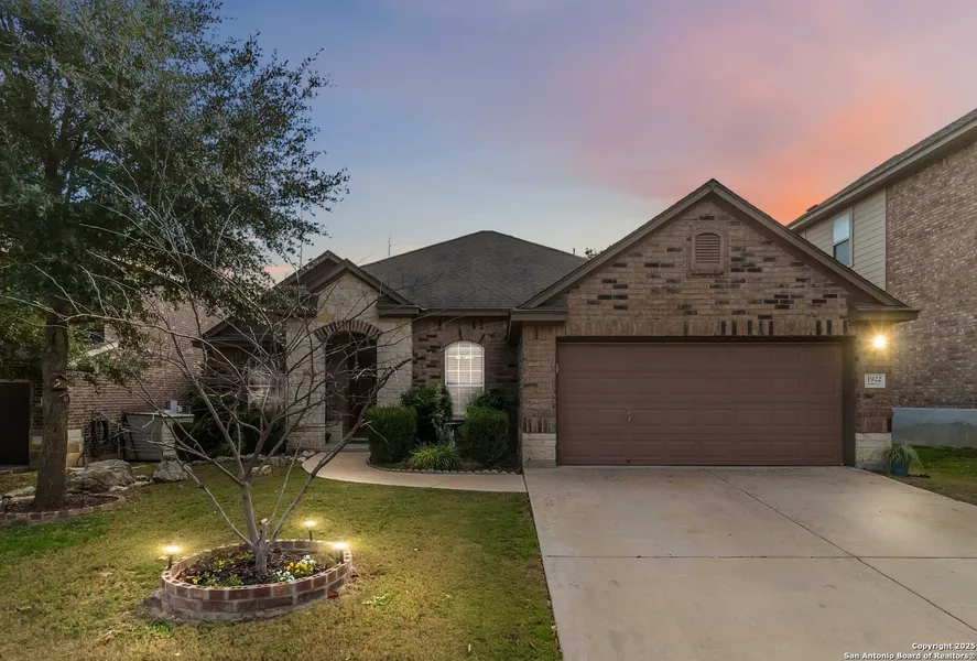 This well-maintained, brick and stone, one-story David Weekley home in the gated Prospect Creek section of Kinder Ranch strikes the perfect balance between luxury and livability. The functional layout with high ceilings and an open concept kitchen-to-living connection is perfect for hosting gatherings or quiet relaxation. Flooring includes tile through the main living areas with wood floors in the dedicated dining room and den. Island kitchen with pendant lighting, ample cabinet storage, stainless steel appliances, and an adjacent breakfast area. Private primary suite with an en-suite bath featuring dual vanity, soaking tub, separate shower, and walk-in closet. Covered back patio overlooks a spacious fenced yard with green space behind - no rear neighbors. Lot offers space suitable for a pool (buyer to verify HOA/city requirements and approvals). Just a few steps to a neighborhood access gate providing direct access toward Kinder Ranch Elementary and Pieper High School. Resort-style community amenities include a swimming pool, sports court, trails, and common areas (amenities subject to HOA availability). Also offers convenient access to San Antonio International Airport (SAT), shopping and grocery options, and Texas Hill Country destinations.