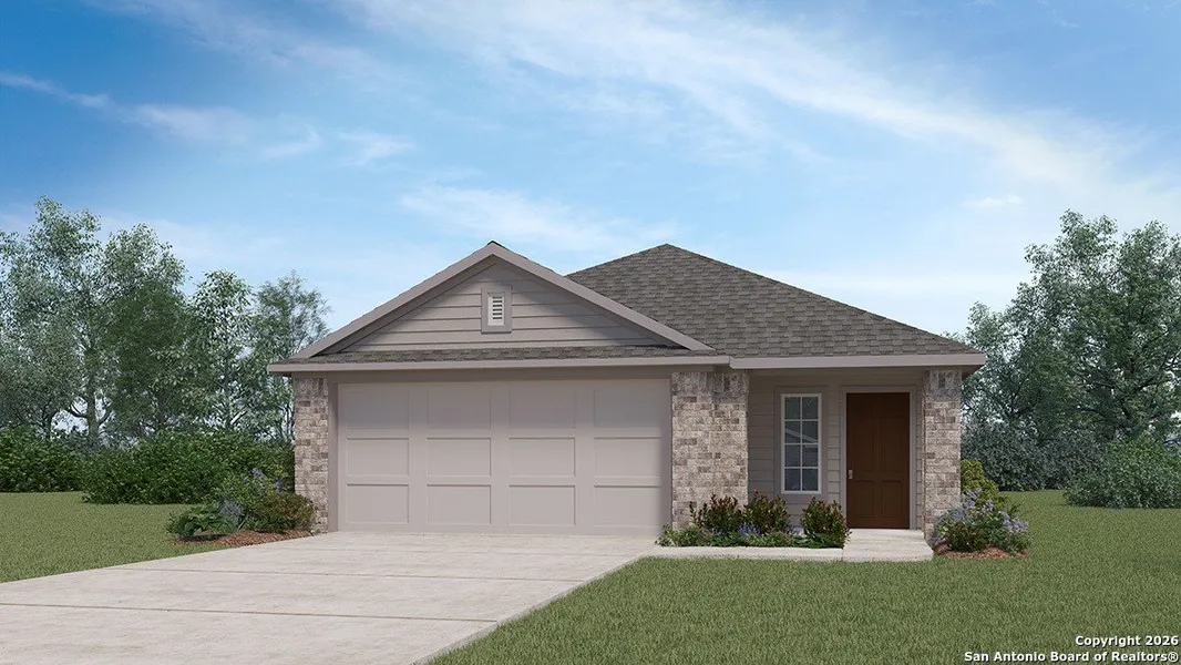 Introducing The Caroline plan, a stunning one-story home featured in Applewood in San Antonio, TX. The Caroline is sure to impress with its classic front exteriors, 3 bedrooms, 2 baths, and 2-car garage. An elongated foyer welcomes you into an open concept kitchen, dining area, and living room, perfect for entertaining. This home's kitchen includes shaker style cabinetry, granite counter tops, stainless steel appliances and a spacious kitchen island with a deep farmhouse style single basin sink. The main bedroom is located right off the living room and features a semi-vaulted ceiling and an attractive ensuite bathroom. You'll enjoy getting ready every day with plenty of bathroom space and modern bathroom features including granite countertops, shaker style cabinets, a tiled walk-in shower and spacious walk-in closet. If privacy is your top priority, this ensuite bathroom comes standard with a separate water closet. Every bedroom has quality carpet, a closet, and windows for plenty of natural lighting. Whether these rooms become bedrooms or other bonus spaces, there is sure to be comfort and functionality. Additional features include a back patio that overlooks a fully landscaped and irrigated yard, sheet vinyl flooring in entry, living room, and all wet areas, and granite countertops and tiled flooring in all secondary bathrooms. This home also comes equipped with our HOME IS CONNECTED base package. Using one central hub that talks to all the devices in your home, you can control the lights, thermostat and locks, all from your cellular device.