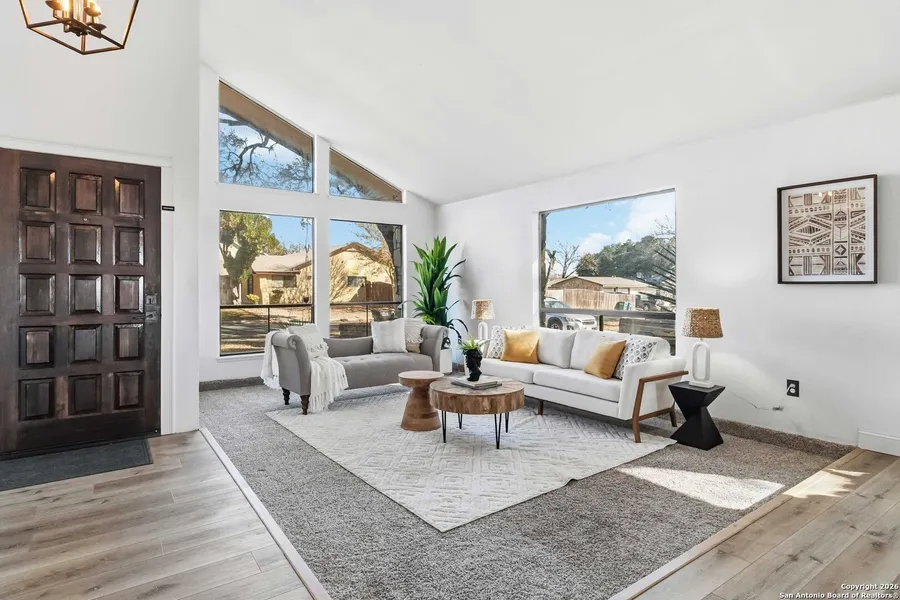 Comfort and convenience come together in this inviting 4-bedroom, 2-bath home with an easy commute to Fort Sam Houston and quick access to San Antonio International Airport. Enjoy nearby McAllister Park, El Dorado Private Lake Park, and shopping at IKEA, making everyday life simple and enjoyable. Inside, two living areas and a bright kitchen with a large island create the perfect space for gathering, while picture windows fill the home with natural light. The primary suite offers French doors and a peaceful retreat. Step outside to a backyard made for relaxing and entertaining, featuring an in-ground pool with diving board, covered patio, and generous yard space. Recent 2024 A/C replacements, a water softener, extra storage, and no HOA add comfort and flexibility.