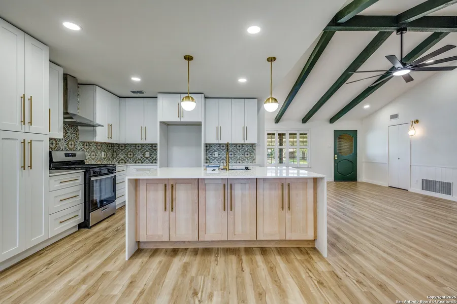 Completely renovated from top to bottom, this 3 bedroom 2 bath open concept home in MacArthur Terrace looks and feels brand new. Bright fresh interior paint, new recessed lighting and updated fixtures along with stylish new flooring throughout. The kitchen exudes luxury with elegant finishes, a stunning waterfall island, soft-close maple cabinets and drawers, brand-new appliances and countertops. Inside laundry room flows into an oversized garage that offers the perfect workshop space with built-in storage