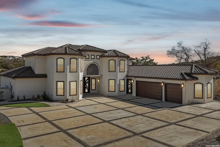 Welcome to luxury living in the prestigious Canyons at Scenic Loop. This stunning 5,456 sq ft modern Mediterranean estate is thoughtfully designed for elegance, comfort, and entertaining - all set against breathtaking hill country views. From the moment you arrive, the grand facade and expansive driveway make a commanding first impression. Inside, soaring ceilings, a sweeping curved staircase, and marble-look flooring create a dramatic yet inviting entry. The open-concept layout flows seamlessly into spacious living and dining areas, anchored by designer lighting and refined architectural details. The chef's kitchen is a showstopper - featuring an oversized waterfall island, custom wood cabinetry, premium appliances, and a statement range hood - perfect for hosting family and guests. Multiple living spaces include a dedicated game room, a private office, and generous common areas designed for modern lifestyles. Retreat to the luxurious primary suite with serene views, spa-inspired bath, and oversized walk-in closet. Three additional bedrooms and three full bathrooms offer comfort and privacy for family or guests. Step outside to enjoy unobstructed hill country views and endless possibilities for outdoor living. The adjacent lot is also available, offering the rare chance to expand your estate or secure added privacy. MLS #: 1908089 Located in one of San Antonio's most desirable gated communities, just minutes from top schools, shopping, and dining - this home delivers sophistication, space, and scenery in perfect harmony. Modern Mediterranean. Hill Country Views. Unmatched Lifestyle.