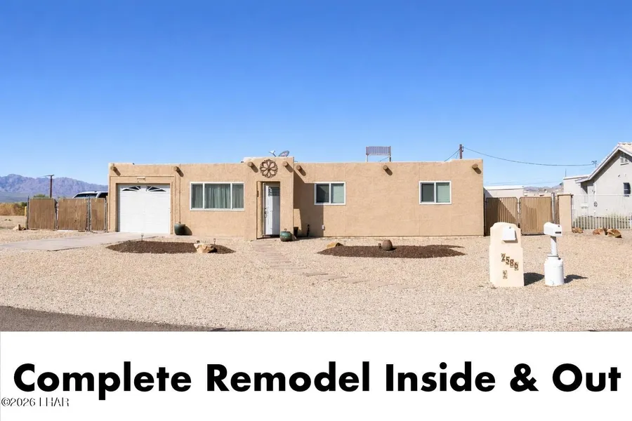 This beautifully remodeled Santa Fe style home has been completely transformed inside and out. Renovations include fresh interior and exterior paint, tile flooring throughout, granite countertops, soft-close cabinetry, and all new fixtures and lighting. With brand-new doors and windows and fresh exterior stucco, the home seamlessly blends modern upgrades with timeless Santa Fe charm, creating a stylish and comfortable living experience. The home offers 3 bedrooms and 2 baths and features a newer air conditioning unit installed Jan 2025. Tucked away in a quiet Northside neighborhood just minutes from the marina, the property boasts lake views from the backyard and backs to a wash, providing added privacy. Additional highlights include convenient gated RV parking on both sides of the home, a fully fenced yard, and ample space to expand, build, or add a pool. The home also features a flat top roof accented by a shingled patio cover. Whether you are looking for a full-time residence or a weekend getaway near the water, this home delivers exceptional value and lifestyle appeal. Opportunities like this are rare and will not last long.