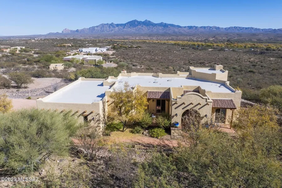 Tucked away behind private gates in The Ranch at Aliso Springs, this exceptional showplace residence delivers a rare blend of serenity and Southern Arizona architectural grandeur. Set on 4+ sweeping acres, the home captures unobstructed mountain panoramas that shift with the sun. Inside you'll find a thoughtful layout anchored by two generous bedrooms, each featuring direct terrace access, plus a versatile flex space, ideal for a den or studio. The heart of the home is the open gathering area, where huge picture windows and a seamless indoor-outdoor flow make entertaining effortless. Expansive covered and open outdoor areas offer room to garden, explore or simply relax. Large three-bay garage features dedicated workshop and epoxy flooring, ideal for both hobbyists and car aficionados.