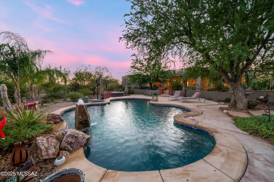 A one-of-a-kind retreat on Tucson's northwest side, this property is perfect for anyone seeking privacy, space, and flexibility. The impressive 30' x 40' RV garage and workshop offers endless options, store your RV, or create the ultimate hobby space. There's also an attached 3-car garage, with the third bay featuring its own mini split system for heating and cooling, ideal for a studio, home gym, or workspace. Set on 3.3 acres with no HOA, this property sits at the end of a quiet cul-de-sac and provides the freedom to live how you want. Gardeners will love the raised planters, irrigation, and shaded areas already in place, just bring your seedlings! After a day outdoors, relax in the heated pool, enjoy mountain views from the spacious patio, or unwind beneath the