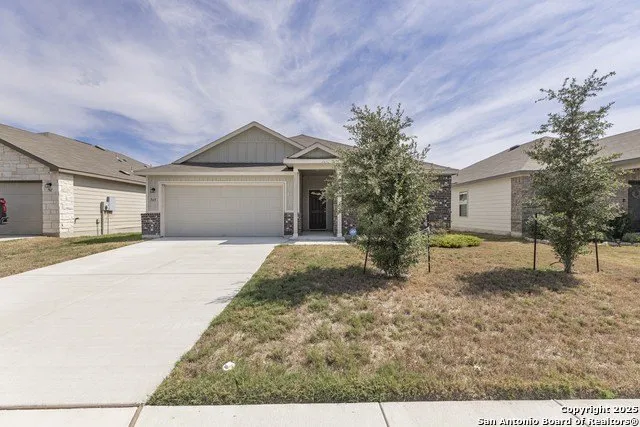 Welcome to Greenfield! This well-maintained one-story home, built in 2021, offers modern comfort and style in a convenient Seguin location. Featuring 3 bedrooms and 2 bathrooms, the open floor plan creates a bright, inviting atmosphere that's perfect for everyday living and entertaining. The kitchen is a true highlight, with an island, granite countertops, and plenty of space for meal prep and gatherings. The primary suite includes a full bath with a walk-in shower for a private retreat. Enjoy relaxing or entertaining outdoors under the covered back patio, with a yard ready for your personal touch. Just a short five-minute walk to both the elementary and middle schools, this home offers everyday convenience right in the neighborhood. With only four years of age, it combines newer construction with thoughtful details in a welcoming community. This property also offers an assumable VA loan at 3.875%, presenting an excellent financing opportunity for qualified buyers!