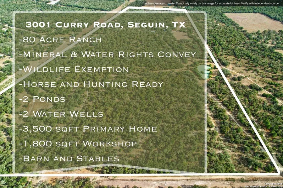 Welcome to 3001 Curry Rd - A Private 80-Acre Ranch Retreat in Seguin, TX. Experience the best of Texas Hill Country living on this unrestricted 80-acre ranch-a rare and versatile property perfect for horses, cattle, hunting, recreation, or simply enjoying the peace and privacy of country life. Currently under a wildlife exemption, this ranch offers a unique blend of natural beauty, modern infrastructure, and long-term value. The heart of the property is a spacious 3,500 sq ft primary residence featuring 4 bedrooms and 3 bathrooms. Originally built in 1972, the home was extensively renovated and expanded in 2019, including a new slab, metal roof, HVAC system, and water softener. The layout includes 30 ft ceilings with large open-concept living and entertaining areas, ideal for hosting family, friends, or simply relaxing while taking in the incredible views, abundant wildlife, and Texas sunsets. A hidden basement concealed behind a bookshelf offers the perfect gun room, safe room, or additional storage space. This property is also great for generational living, with a detached 800 sq ft guest house/casita that's perfect for extended family, visitors, or use as a hunting lodge. Additional features include: Two private water wells, fully paid off solar panels, an 1,800 sq ft workshop with three oversized RV doors and Big Ass Fans, a storage barn for feed, equipment, or tack, a two-stall horse stable and corral, chicken coop, one-acre irrigated orchard, 3-acre fenced and cross-fenced pasture for livestock with irrigation attachment, two ponds, and two hunting blinds. A tractor and all attachments will convey with the sale, providing everything you need to manage and enjoy the land from day one. Even more valuable, 100% of the seller's owned mineral rights and water rights will convey, ensuring long-term opportunity and security for future generations. Whether you're looking for a working ranch, recreational retreat, or a multi-family compound, 3001 Curry Rd offers a rare chance to own a legacy property with unmatched versatility and comfort. Call today to schedule your private tour of this exceptional ranch!