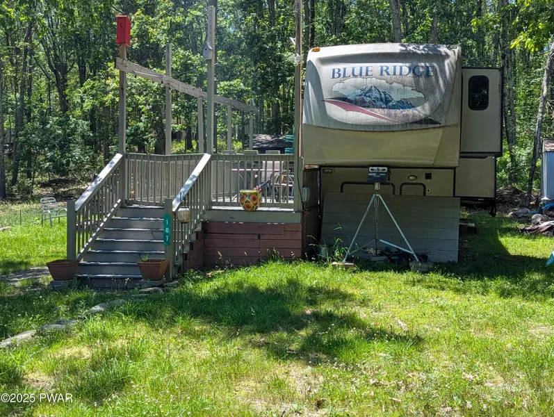 Neat and Clean Fifth Wheel with large open deck . Situated on a nice level lot with green area behind giving some privacy.2 Bedrooms, Open living room, dining and kitchen. Room for the whole family. Large shed . Walk to playground, pool and club house. Trails End is an active recreational park located close to Historic Milford and Shohola Falls.