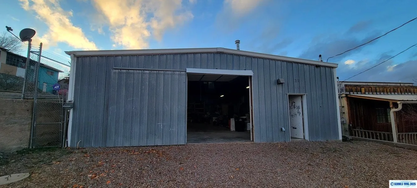 50' x 40' metal-constructed building with concrete floor, currently used as a warehouse and offering flexible commercial or storage potential. Features include one half bath, evaporative cooler, built-in storage shelving, and an overhead roll-up garage door concealed behind a metal sliding door that matches the exterior, along with a separate standard entry door for convenient access. City water and electric. Gas line to the street; building previously had gas heat, though the meter has been removed. Small fenced areas to the side and rear provide added functionality, with several on-site parking spaces. Easy to see and show. Seller is also offering 308 S Bullard St for sale along with 310 S Bullard St - Both for $350,000.