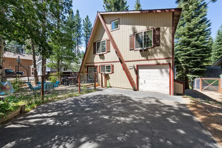 This charming 5-bedroom, 1.5-bath home located in the desirable Tahoe Paradise community, offering comfortable living with a blend of rustic charm and modern updates. The main living area downstairs features open beam ceilings that create an inviting, spacious atmosphere. The remodeled kitchen is a chef's delight, equipped with ample cabinetry, stainless steel appliances, and a convenient hanging pot rack, perfect for preparing meals and entertaining. Downstairs also includes two bedrooms, a full bathroom with a classic clawfoot tub, a versatile office or den space, and additional storage, providing flexibility for your lifestyle needs. Upstairs, vaulted ceilings enhance the three additional bedrooms and a convenient half bathroom, creating a bright and airy retreat for family and guests. Step outside to an expansive backyard complete with a storage shed and a relaxing hot tub ideal for ...