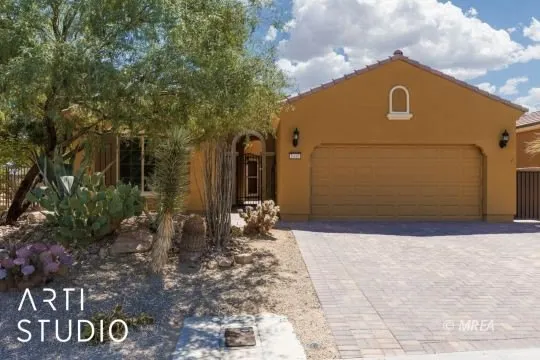 Seller will consider financing this 2-BR + den on a quiet & large corner 0.19-acre lot. Conveniently located 1/2 mile to Sun City's Clubhouse with gym, indoor/outdoor pools/spas & lots of fun activities. Fully fenced huge backyard is landscaped with gorgeous mature trees & shrubs with waterfall feature and sitting area to enjoy mountain views. Beautiful stain resistant paver driveway and walkway leads to a courtyard entry adding charm and curb appeal. Circular foyer creates an inviting space with aesthetic appeal. Diagonally laid tile throughout, except carpet in guest bedroom, makes space appear larger & look a bit more exciting. Stainless steel kitchen appliances & washer/dryer included. Bay window in main bedroom transforms look & feel of allowing more natural light, adds visual depth & creates a cozy nook that can serve as extra seating for a quiet retreat. Ensuite bathroom has soaking tub & walk-in shower. Bonus room separates laundry room & garage that can be used as a workshop or hobby room. Covered patio has paver flooring that's extended throughout the large backyard enhancing the outdoor living space with mature trees, waterfall feature & sitting area with mountain views.