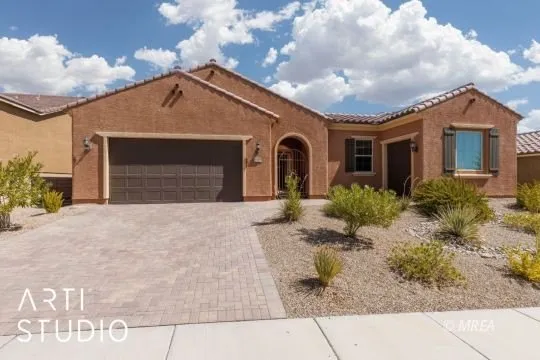 SIDS Paid & Priced to Sell! This Journey model at a generous 2537 sq/ft with a golf cart garage and fully a pavered courtyard is one of the best priced homes in Sun City Mesquite. This open and roomy floor plan boasts an open concept with the kitchen, dining room, and living room blending seamlessly together for the ultimate living experience with more than enough room to entertain your guests. A second bedroom functions as an ensuite with a full bathroom, walk-in closet and an window looking out into the courtyard. Enjoy the roomy main bedroom suite with tiled shower and walk-in closet. The rear covered patio has been extended giving it nearly double the space for entertaining or relaxing. Other upgrades included plantation shutters, upgraded tall baseboards and recently installed beautiful plank tile flooring throughout the home. Other notables are, a large pantry, utility area with a upgraded cabinets, and a good sized laundry room tucked away from the living area. This home is in move in ready condition with neutral colors thought, making for an easy move in. Book your showing today.