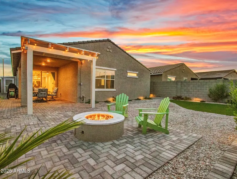 Skip the construction wait! Built in 2023, this home feels better than new and is ready for you now & has bells & whistles too. The open-concept layout brings everyone together, while the 4th bedroom and bonus flex room offer versatile space for a home office, gym, or playroom. The real magic happens outside: unwind in a completely finished backyard featuring mountain views, a cozy fire pit, and a pergola-perfect for sunset gatherings. With private single-level neighbors, an EV-ready garage, and a storage shed, every detail is covered. This popular floor plan is sold out elsewhere, so don't miss this rare find!