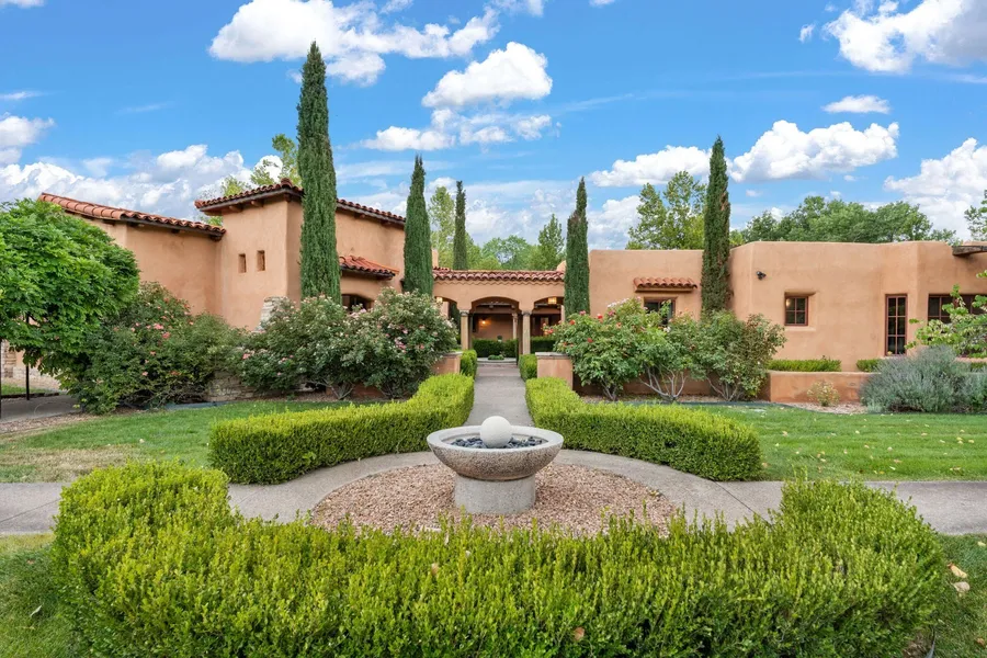 Gorgeous, peaceful, remarkable. A beautiful mediterranean adobe villa by John Calvin. Set in a lush and well-manicured setting on a very special street in the Village of Los Ranchos. Walk or ride your bike to Los Poblanos Historic Inn, Campo, Los Ranchos Growers Market, and much more. The home features a chef's kitchen, spacious en-suite bedrooms, stunning garden views from every window, and a large koi pond and a private irrigation well. Radiant heat, central AC, Wolf range, 5 fireplaces including an outdoor kiva, travertine floors, 3 Car garage. Separated & Quiet Master Suite. Kitchen features include Wolf range, subzero fridge, double-oven, wine cooler, & oversized island. Enjoy views of the gardens and landscaping from every room, with a walled backyard.