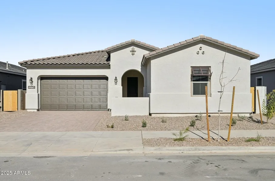 Welcome to this beautifully designed Jade floor plan offering 2,802 sq. ft. of refined living space on a desirable south-facing front homesite in Madera at Queen Creek. This spacious home features 4 bedrooms, 3.5 bathrooms, a versatile den, a formal dining room with a butler's pantry, and a 2-car garage. The exterior showcases timeless Spanish-style architecture, while the interior is finished in the warm, earthy Harmony designer palette with elevated touches such as matte black cabinet and door hardware, champagne bronze bath vanity lighting, and bronze interior door hardware. The gourmet kitchen is the heart of the home, complete with white cabinetry, a deco-wrapped island, Hana Sky quartz countertops, a 5-burner GE Profile gas cooktop, built-in oven and microwave, chimney-style hood, and a textured tile backsplash. The great room, den, and dining room are light-filled and open, featuring 6" x 36" Hill House Natural tile flooring throughout, with upgraded carpet in the bedrooms for comfort. The 4-panel sliding glass door leads to a north-facing backyardready to be personalized with a pool, garden, or outdoor kitchen. The primary suite is a private retreat with an enlarged walk-in shower tiled partway up the walls, dual sinks, quartz countertops, and Melrose champagne bronze vanity lighting. A tankless water heater adds comfort and efficiency, while a covered patio, double side gate, and garage service door enhance functionality. Conveniently located near the community's heated pool and spa, pickleball and basketball courts, playgrounds, walking trails, and community firepit, this home is just minutes from Frontier Family Park, top-rated schools, and Queen Creek's best shopping and dining.