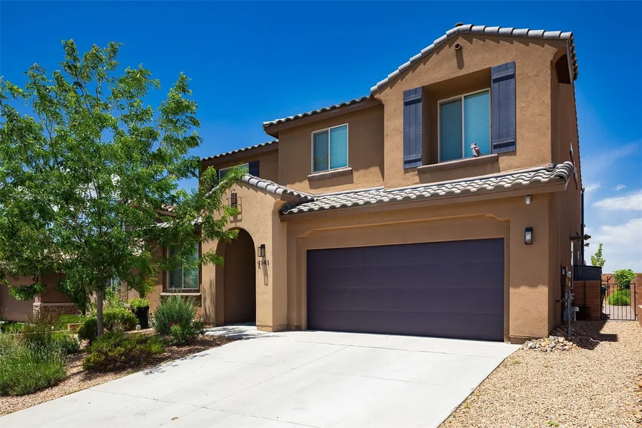 This fine home dazzles under the sure hand of its designer owner. The floorplan is a deft blend of elegance and comfort. Its light, open feel includes defined yet versatile spaces that serve a range of lifestyle needs. On the first floor is a bedroom with ensuite bath. The handsome Cook's Kitchen, with quartz countertops, stainless steel appliances, and adjacent Butler's pantry/office, overlooks the chic living area, with fireplace. The dining room feels at once spacious and intimate. Both living and dining rooms open to the splendid backyard with arching grape vines, a trellised wall of trumpet vines, sprays of ornamental grass, a stretch of turf, raised beds and a newer hot tub. A spiral staircase connects this enchanting oasis with the upper deck, off the Primary Bedroom, with long range views of several mountain ranges. The second story's flexible layout includes a large den or office, a sizable craft room, and two additional bedrooms. Come experience this inviting Las Soleras home, conveniently located close to Presbyterian Hospital, shopping, restaurants and major transportation routes.