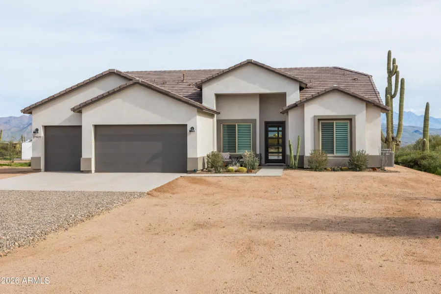 Upgraded newer home in Rio Verde Foothills with scenic desert and mountain views, conveniently located close to Rio Verde Drive. This well-maintained property features an added gravel driveway, inviting xeriscape landscaping in the front entry, EPCOR water with an active account, and a private 5000 gallon water storage tank. The interior offers a welcoming living space with a custom stone fireplace and a gourmet kitchen featuring GE Profile appliances, quartz countertops, herringbone backsplash, and custom cabinetry details. Additional highlights include fully tiled bathrooms, designer black fixtures and hardware, custom shutters throughout, premium carpet, and a whole-house water filtration system with RO and water softener. A move-in-ready home with thoughtful upgrades, combining comfort, quality, and peaceful desert living.