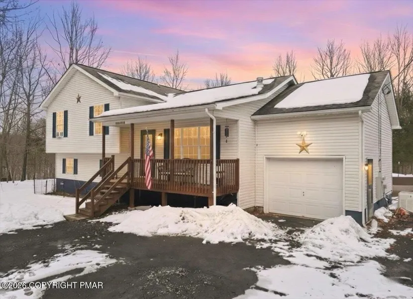 Welcome to this beautiful split-level home set on a half-acre in desirable Timber Hills, just minutes from Pocono attractions, shopping, and major routes. This 4-bedroom, 3 full-bath property offers an open-concept main living area with wide-plank flooring, exposed beam detail, and a striking wood accent wall with freestanding propane stove that creates a warm focal point. The kitchen features ample cabinetry, stainless appliances, and an island with seating, seamlessly flowing to the rear deck through sliding glass doors--ideal for entertaining and outdoor enjoyment. The lower level includes a kitchenette, providing excellent flexibility for guests or extended living arrangements. Additional highlights include a whole-house generator, 3 new mini-splits for heat & AC, fenced yard, oversized shed, attached one-car garage with loft space offering future finishing potential, and generous ou...