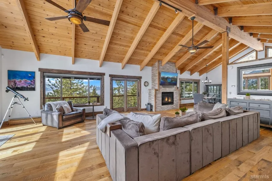 Expansive Lake Tahoe views define this luxurious mountain retreat, where modern comfort meets natural beauty. Nestled among towering pines, this stunning home offers a perfect balance of serenity and conveniencejust minutes from Heavenly Ski Resort and the vibrant energy of South Lake Tahoe. From the moment you step inside, the panoramic lake and mountain views take center stage. A plethora of windows frame the water's endless blue, bringing the outdoors in, while soaring wood-beamed ceilings and premium hardwood flooring create an inviting warmth. The spacious living area is anchored by a stone fireplace, offering the perfect setting for cozy winter evenings or relaxed summer nights. Just beyond, an expansive redwood deck provides a breathtaking vantage point to watch the sun dip behind the peaks, casting golden reflections across the lake. The gourmet kitchen is designed for both style...