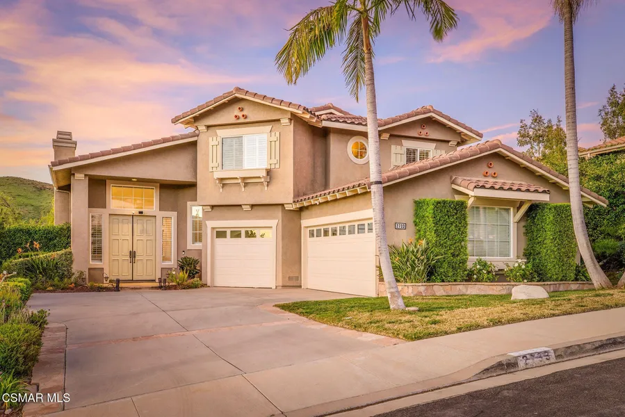 Set on a quiet cul-de-sac in sought-after Lang Ranch, this beautiful and spacious home offers nearly 3,000 sq ft of light-filled living space designed for both comfort and ease. Soaring ceilings and warm wood floors create an inviting first impression as you enter through the double doors into the living and dining areas, anchored by a cozy fireplace with an open, airy feel. The main living spaces flow effortlessly into the kitchen and family room, making the home feel connected and livable. The kitchen features a large center island with seating, double oven, pull out shelving and a generous workspace, opening directly to the family room where a second fireplace creates a relaxed gathering space for everyday living or entertaining. The main level features a bedroom and full bathroom, offering flexibility for guests, extended family, or a home office. Rounding out the first floor, a dedicated laundry room is thoughtfully sized and positioned for everyday convenience. Upstairs, the primary suite is a true retreat, complete with mountain views, a spacious walk-in closet and bathroom featuring quartz countertops, updated dual vanities, a soaking tub, and separate shower. Two additional bedrooms share a beautifully remodeled hall bathroom, and a built-in work or study area provides extra flexibility for today's lifestyle. Outdoors, the private backyard feels like a resort, featuring a pool and spa with waterfall, along with space for dining, entertaining, and play. A three-car garage, neighborhood parks, and nearby shopping and dining add to the appeal. The home is zoned for award-winning, highly sought-after Lang Ranch Elementary School.