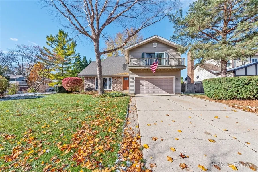 Welcome to this striking Augusta model located in the desirable Four Colonies subdivision of Crystal Lake. Set on a prominent corner lot, this spacious 4-bedroom, 2.5-bathroom single-family home offers an impressive blend of character, comfort, and convenience. Inside, you'll find soaring vaulted ceilings, a dramatic sunken living room, and an inviting open-concept layout ideal for everyday living and entertaining. Rich hardwood floors flow throughout much of the main level, while three sliding glass doors bring in exceptional natural light and connect seamlessly to the outdoors. Step outside to enjoy a large deck and a refreshing swimming pool, perfect for warm-weather relaxation. The large open loft overlooks the living room, offering versatile space for an office, playroom, or additional lounge area. The primary bedroom provides a true retreat with vaulted ceilings, a walk-in closet, a private balcony, and an updated en-suite bathroom completed in 2021. Additional recent improvements include the main-floor half bath laundry room, and family room, all updated in 2023, adding modern comfort and convenience. Located just minutes from Downtown Crystal Lake, the Metra station, Randall Road, and near Four Colonies Park, this home offers the perfect blend of tranquility and accessibility. With its unique architectural detail, thoughtful updates, and prime location, this Four Colonies gem is ready to welcome its next owner.