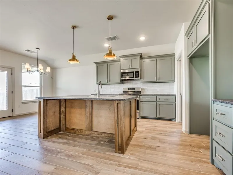Welcome to Council Ridge, one of Edmond's most desirable communities, where modern farmhouse charm meets everyday comfort. This stunning 3-bedroom, 2.5-bath home offers not just beautiful design, but also incredible value-the builder is giving you $10,000 in buyer incentives to use however you wish! Need closing costs covered? A storm shelter? Blinds? A rate buy-down? You get to choose what works best for you. From the curb, this home is a showstopper with its farmhouse-style front door and teal shutters that instantly catch the eye. Step inside and you'll find yourself drawn to the heart of the home-the open-concept kitchen. A massive island topped with leathered granite makes a bold statement under the glow of modern pendant lighting. White quartz countertops in the bathrooms and wood-look flooring carry that clean, timeless farmhouse feel, while the giant walk-in pantry ensures storage will never be a problem. Stainless steel appliances tie the whole space together with a sleek, modern finish. The split floorplan offers both privacy and flow. The master suite is tucked away as a true retreat, with blue painted cabinets that bring personality and charm, paired perfectly with the floral tile that accents the tub surround. A spa-like feel meets practicality with a huge walk-in closet. Two additional bedrooms share the other side of the home, along with a full bath and a powder bath for guests. Hallways include incredible built-in cabinets adding to the home's storage. The living space extends outdoors with a backyard fireplace, creating the perfect spot for cozy evenings, entertaining friends, or simply relaxing under the Oklahoma sky. And when you're ready to get out of the house, Council Ridge has its own community pool just around the corner. This home combines thoughtful design, striking modern farmhouse finishes, and unbeatable buyer incentives, making it more than just a house-it's your next home.