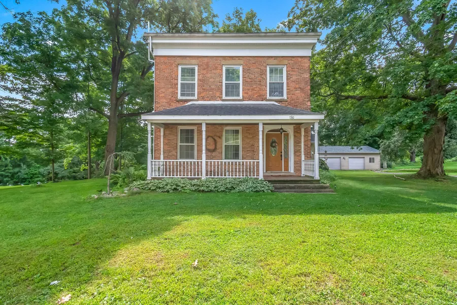 Step into timeless elegance with this beautifully maintained historic brick home, perfectly blending original character with modern updates. From the moment you arrive, the grand entryway sets the tone for the warmth and charm that fills every room. The heart of the home is the spacious hickory kitchen, featuring a stunning original brick wall, vaulted wood ceilings, recessed lighting, and an incredible amount of counter space and cabinetry. Wood floors and an antique butcher block island complete this inviting space, ideal for cooking and entertaining. Enjoy formal gatherings in the elegant dining room with gleaming natural wood floors, or relax in the cozy living room, showcasing original woodwork around doors and windows that add character and charm. An open stairway leads to the second level, where you'll find a generous landing, built-in cabinetry, a half bath & three bedrooms. Outdoor living is just as impressive with two inviting covered porches and a shaded rear patio, perfect for quiet mornings or evening gatherings. The expansive 3.43-acre lot is a park-like oasis, complete with a fenced area for pets or children, mature trees, and endless possibilities for gardening or play. A separate outbuilding off the patio, originally built for a hot tub, now offers great potential as a storage area or garden shed. Plus, enjoy the convenience of a four-car detached garage and a newer central air unit for year-round comfort. This is truly a one-of-a-kind property offering space, charm, and serenity - all within the city limits. Don't miss your chance to own a piece of history with modern comfort!