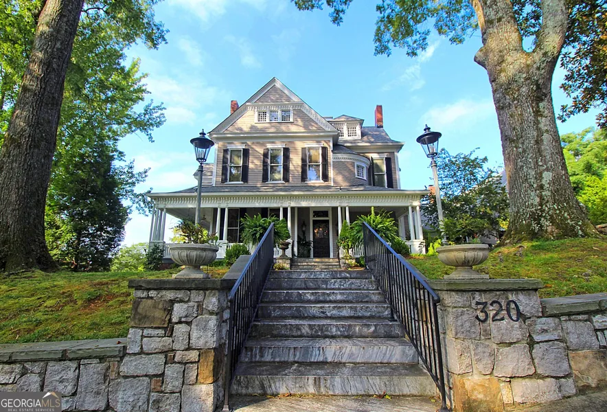 Built in 1890 by the Fahy family, this beautiful Victorian home is located "Between The Rivers" in Rome, Georgia in the heart of the downtown Historic District. The home has been thoughtfully restored over the years with the current owner investing substantially in upgrading the areas where time and weather had aged the structure. Walking onto the property one sees beautifully manicured grounds, a fountain, plantings, and a welcoming front porch that has hosted parties, weddings, children's laughter and thoughtful conversations over the past 135 years. Entering the home through the custom wooden door , a living room, formal dining room, music room, and sitting room, flow into the renovated kitchen. The kitchen offers stainless steel Wolf appliances, custom cabinets, and stone countertops. Each room on the main level offers a fireplace, hardwood floors and a chandelier. The current owner has installed an elevator just off the kitchen that ascends to the upper level. The upper level staircase leads to the primary bedroom suite along with three other bedrooms. Each bedroom has a fireplace, chandelier and all but one its own full bathroom. The primary bedroom adjoins a large full bathroom with marble floor, walk in shower separate tub and large closet. The terrace level includes a wet bar , sauna, bathroom, and opens to a covered patio and an amazing back that includes a bocci ball court, stone terraces and formal English Gardens. An attached three car garage offers additional living space with two bedrooms, a kitchenette and a living room or office. This space is ideal for an in-law suite or visiting guests. The beauty, history and location of 320 East Third Avenue make it one of the most treasured and desirable properties in the City of Rome.