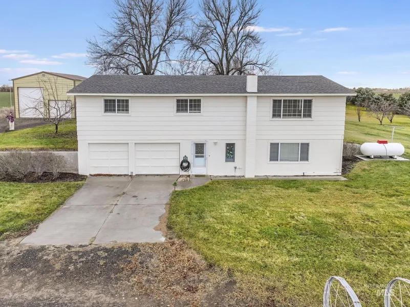 The comforts of country living with the convenience of the city of Gooding just 3 miles to the West. This 4.990 acre parcel features a spacious 2300 sq ft plus home that provides for ground level access to the main floor along with ground level main entry and daylight basement entry. its unique design provides for a 2-car attached garage with access to the daylight basement. Updated flooring, updated kitchen and baths. This property offers a country opportunity with 0ne acre currently in alfalfa with its own wheel line and pressurized main line from the private pond. An extensive manual sprinkler system has been installed to water the yard . Numerous fruit trees are present . Loafing shed and garden area. Two shops top off the list of amenities, one with concrete floors, overhead door, propane heat and home for the solar system that services the home. The solar system is owned. Ingres...
