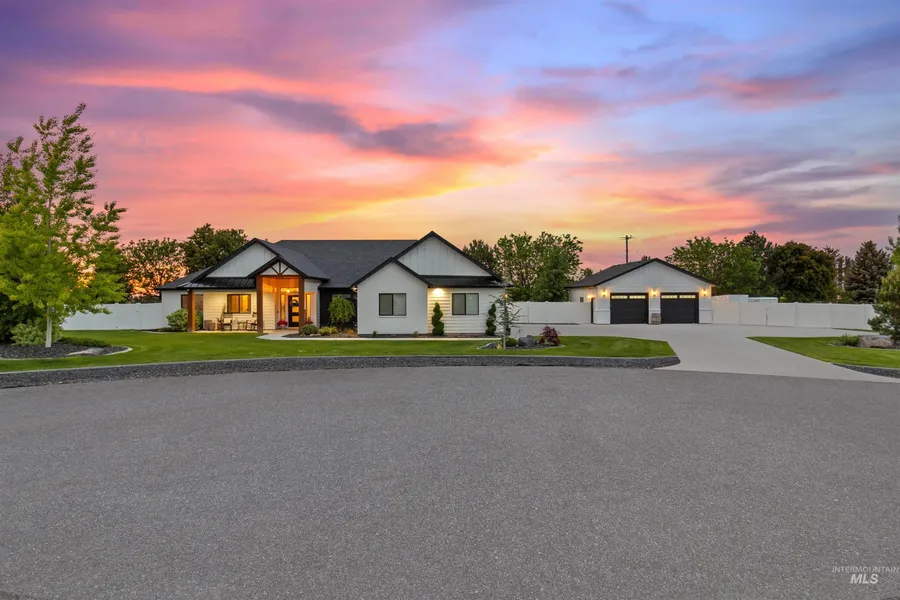 Experience unparalleled living in this custom-built, single-level home on a sprawling acre in the coveted Destination Pointe subdivision. Crafted in 2021 with modern elegance, this 4-bedroom, 2.5-bath sanctuary blends luxury with functional design. The gourmet kitchen boasts double chiseled edge granite countertops, a six-seat island, and a hidden Butler's pantry. It flows into a vast living and dining area under vaulted ceilings. Entertain on the 605 sqft. covered patio with a fireplace, heaters, fans, and an outdoor kitchen. The outdoor space also includes a fenced yard, fire pit, and a pad wired for a hot tub. The master suite offers a spacious walk-in closet and soaking tub. The home features sound and security systems, plus ample storage in a three-car garage and 30x30 shop. Bring all your toys—there's space for RVs, boats, and more.