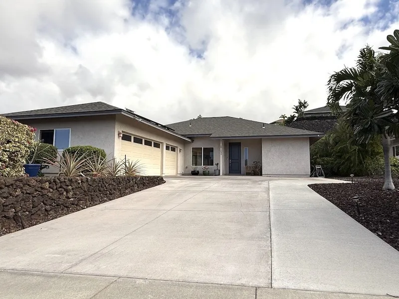 Don't miss this comfortable island-style home with a solar PV system, air conditioning, an oversized garage, and a private, low-maintenance yard. Located on the best street in desirable Sunset Ridge at Waikoloa Village in an area of newer homes, this well-maintained, 3-bedroom, 2-bath, 1,741 sq. ft. home features an open concept living area with 9' ceilings for a spacious feel, direct access from the dining area & primary BR to a large covered lanai, an oversized 3-car garage and more. Additional features include: - Owned PV system w/18 Kw battery and 16 360-watt panels for low electric bills (about $30/month). Installed 2021. - Split-zoned AC installed April 2022 (4 zones). - The Primary suite is located on opposite side of the home from the other bedrooms. - Custom shelving in primary suite - Dedicated laundry room w/sink & built-ins - Wyze wireless security system - Intimate back yard...