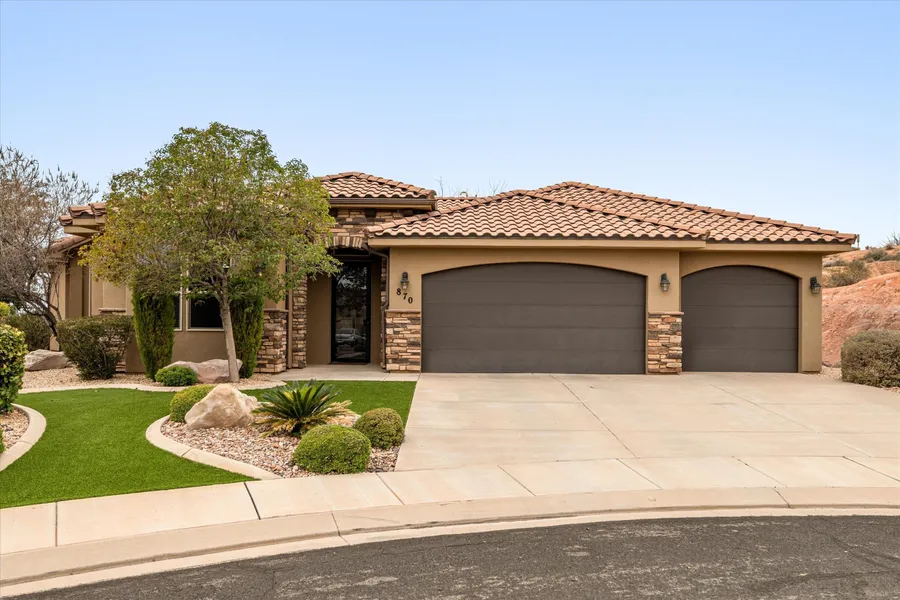 Tucked at the end of a quiet cul-de-sac and backing to a natural desert wash with open hillside to one side, this home offers real privacy with no rear neighbors. It feels removed, yet you're just 2-3 minutes to I-15, the Grapevine Trail System, golf, Maverik, and major retail (Costco, Home Depot, Walmart, In-N-Out). The 3-car garage easily fits a couple of vehicles, your side-by-side, bikes, and golf clubs. Rich cabinetry, stainless appliances, wood shutters, and a bedroom that doubles as an office/library with beautiful custom built-ins. Fully paid 10-panel, 3.7 kW solar keeps utility costs low. Covered patio completes the picture.
