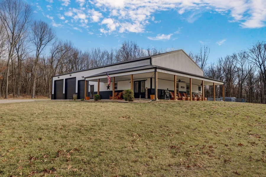 Built in 2022, this exceptional custom barndominium is perfectly situated on 20 acres of partially wooded land, offering the ideal blend of privacy, beauty, and functionality. Tucked behind a gated entry with 5-wire fencing surrounding the entire property, this rare setup is ideal for cattle, recreation, or a peaceful country retreat. Enjoy your own private pond, adding to the beauty and usability of this stunning property--relax and take in peaceful views while soaking up the quiet country setting. Inside, you'll immediately appreciate the beautiful craftsmanship and thoughtful design throughout, featuring soaring ceilings, an airy open-concept layout, and stained concrete floors that deliver both style and durability. The kitchen is made for gathering with abundant custom cabinetry, a spacious walk-in pantry, and plenty of room to entertain with ease. The main level offers two bedrooms...