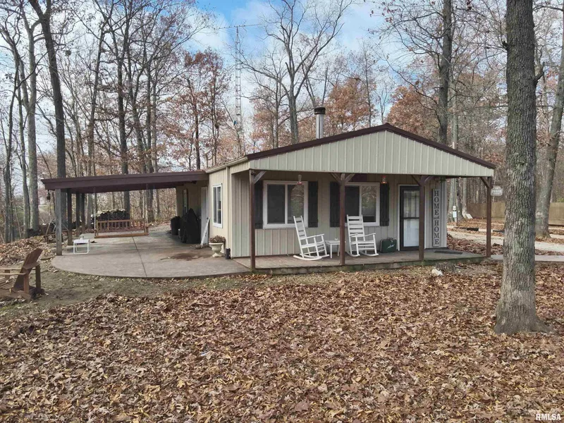 Discover peaceful country living with this unique 2 bed, 2 bath pole-barn style home nestled on 27 wooded acres at the end of a quiet dead-end road. Enjoy morning coffee on the covered porch, relax on the shaded patio, or unwind around the fire pit while taking in the sounds of nature. Inside, the cozy living room features a wood-burning stove, perfect for cool evenings. Outside, you'll appreciate the detached garage complete with a custom-built bar that stays with the property. A 20x8 concrete storm shelter is located behind the garage. Two full RV hookups and plentiful parking offer exceptional convenience for guests or outdoor enthusiasts. With abundant wildlife and room to roam, this property provides the ideal combination of comfort, privacy, and recreation.