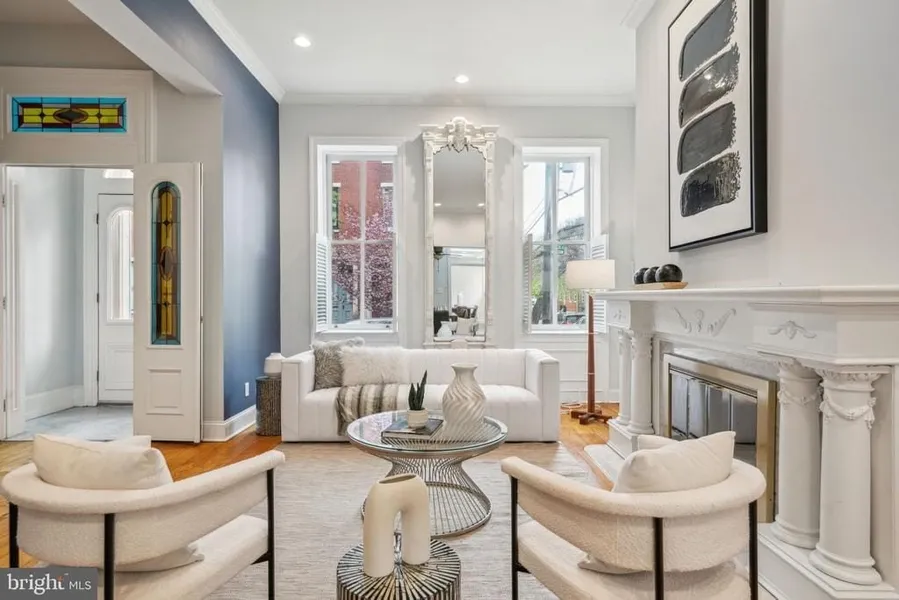 Stately Corner Townhouse with Rare 2-Car Garage in Historic Spring Garden! This impressive corner townhome spans over 4,000 square feet and offers a rare 2-car GARAGE in the heart of the historic Spring Garden section of the Art Museum neighborhood. Set on a prized corner lot with north, east, and south exposures, this elegant 22-foot-wide residence masterfully combines timeless architectural details with modern luxury. Enter through a marble vestibule with original stained glass into a soaring central staircase hallway, where you'll find restored moldings, wide-plank hardwood floors, and an open layout that connects each gracious room with effortless flow. The sun-drenched living room features tall windows, a gas fireplace, and northern and eastern light throughout the day. A dramatic custom glass mezzanine on the second floor overlooks the dining room below, creating a dynamic visual c...