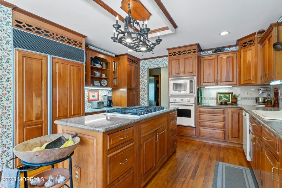 Discover timeless elegance and superior craftsmanship in this custom-built, four-bedroom, three-and-a-half-bath estate, offering over 3,800 square feet of beautifully finished living space. Perfectly situated on a quiet cul-de-sac and set on a landscaped one-acre lot, this home blends classic design with modern comfort. Built by the original owner with meticulous attention to detail, it welcomes you with a grand entrance featuring a solid mahogany front door and a marble-accented foyer with soaring 26-foot (approx.) ceilings that create an unforgettable first impression. Inside, you'll find rich hardwood flooring, custom inlays, and recessed lighting throughout. The formal living room impresses with 18-foot ceilings and a natural stone fireplace set on its own foundation, while the elegant dining room is framed by French doors and highlighted by 9-foot ceilings. The gourmet kitchen is a ...