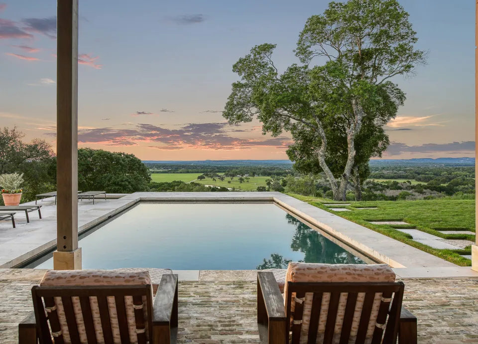 Outside, the artistry of stone continues to shape the landscape, with detailed native Sisterdale limestone forming patios, courtyards, and fire pits that create intimate outdoor living rooms. A stunning 38-foot pool with a deep 12-foot end and adjoining hot tub invites year-round enjoyment, all while overlooking the sweeping valley below. Multiple shaded porches and seating areas throughout the grounds provide spaces to gather, reflect, and savor the beauty of Sisterdale Farms.