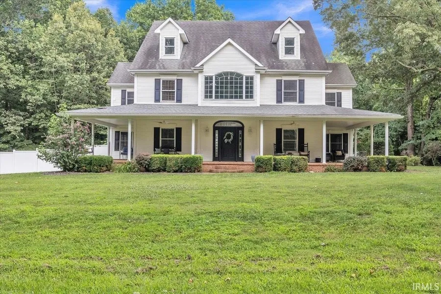 Elegance meets modern farmhouse: this two story home, with its 10' wrap-around covered porch, almost 5 acres, and a pole barn, is a rural Boonville gem. The large foyer has 19' ceilings and leads you in to the dining room, office, half bath, and large living room, all with 9' ceilings (first and second floor) and custom blinds. The main feature has to be the culinary masterpiece kitchen, with its KitchenAid appliances, a separate chef's sink, three ovens, a gas range, huge pantry, three level quartz bar, and a separate eat-in area. Upstairs, all three bedrooms have their own private remodeled full bath and access to a central family space. The upper level also has one of the two laundry rooms with a sink, counter, and cabinets. The owner's suite bath has a huge tiled surround sunken tub, twin vanities, and a 5x6 tiled shower with dual heads. The house has a recirculating hot water pump for quicker hot water. A guest/in law suite/4th bedroom or bonus room 'wing' is available over the garage and has another laundry/lay down space with full bath off of the garage. The 2.5 car garage is attached to the expansive exposed aggregate driveway. The 30x40 insulated and heated pole barn has concrete, electric, 10' overhang, 16' overhead door, and a large 16x30 walk-up and floored loft area for storage. The rear 9x26 deck offers another entertaining zone and welcomes the new 26' above ground pool. For the dogs or kids, there are two fenced-in areas. The 4.9 acres offers additional opportunity for wooded exploring, hunting, and a peaceful rural experience off a paved county road.