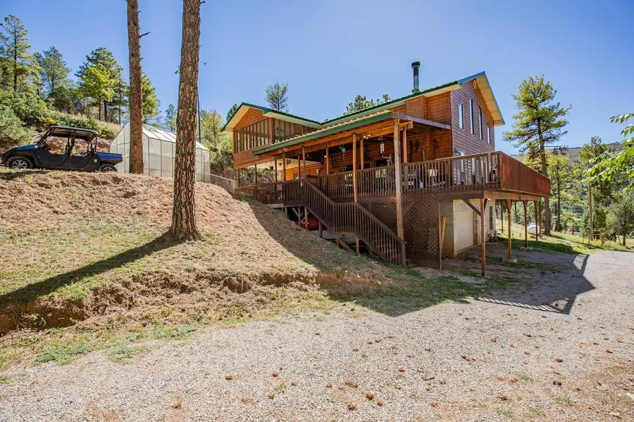 This charming mountain log-sided home offers a perfect blend of rustic elegance and modern comforts, nestled on a sprawling unrestricted 6-acres that backs directly onto the stunning Lincoln National Forest. With three spacious bedrooms, this residence is ideal for families or those seeking a peaceful retreat. The main living area features high ceilings and large windows, allowing natural light to flood the space and providing amazing views of the surrounding forest. The open floor plan seamlessly connects the living room, dining area, and kitchen, making it perfect for entertaining. A cozy stone fireplace adds warmth and ambiance, creating a welcoming atmosphere. The main living space includes 2 of the 3 bedrooms located in the home with a shared full bath. Make your way upstairs to where you will find the a loft area that could be utilized has a home office, game area or another sleeping space for guests. Make your way to the large primary bedroom with en-suite bath and a relaxing screened in porch area to sit out and relax during the cooler months. Take in the cool mountain air in this space while curled up reading your favorite book or an afternoon nap in the cool mountain breeze. The finished basement expands the living space further, offering versatility for recreation, storage, or a separate living suite. This space is where you will find the laundry area, half bath and access to the garage. Outside, the property features horse corrals, making it an ideal setting for equestrian enthusiasts. A large metal workshop provides ample space for projects, hobbies, or storage, catering to those who appreciate hands-on activities. The home’s secluded feeling location ensures privacy while still being within reach of outdoor adventures, hiking trails, and natural beauty. This log-sided residence is a true mountain retreat, combining comfort, functionality, and a connection to nature. Make sure to schedule your showing today and don't forget to check out the 3D virtual tour