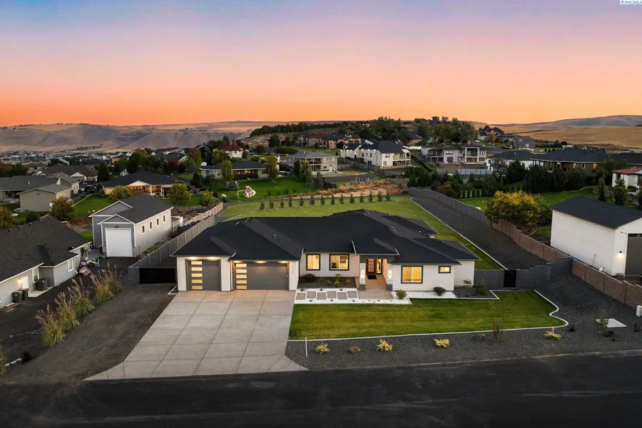MLS# 288334 The Wallowa Estate, set on 1.2 acres in Summit View, is an expansive single-level custom rambler by Craftmark Custom Homes designed to make everyday living look & feel extraordinary. With interiors curated by award-winning Dochia Interior Design, every selection, texture, surface, & line speaks to refined taste and quiet luxury. A grand entry sets the tone for a home that balances scale with comfort. In the heart of the plan, the living space rises to 11-foot coffered ceilings and centers on an 80-inch linear vapor fireplace, a true conversation piece for gatherings. The bright, charismatic kitchen commands attention with a 36-inch Signature Kitchen Suite gas range beneath a custom hood, a dramatic quartzite island, & LED-lit European-style cabinetry. 2 generous pantries and a dual-zone beverage cooler make it as functional as it is beautiful. Designed for privacy, the home offers 4 spacious bedroom suites, each with its own en-suite bath and walk-in closet. The opulent primary suite is a sanctuary with 11-foot ceilings, oversized windows, a large walk-in closet, and a spa-inspired bath featuring a soaking tub, designer tile shower, and dual vanities. Purposeful flexibility defines the plan: a private office (easily converted to a 5th bedroom if desired), a powder bath, an expansive drop zone off the laundry room, + an additional flex space - ideal for media, fitness, play, studio, or guest overflow. Outdoors, the property has been fully renewed with professional landscaping. An expansive yard is framed by block fencing with dual access gates and freshly planted trees, creating privacy and a stunning backdrop to life inside. Entertain or unwind beneath the covered patio, with ample room for future additions - there’s truly space for both a pool and a shop. For those who value capability as much as design, the garage complex overdelivers: a 40-foot RV bay with 11.5-foot ceilings, 2 additional bays, 320A electrical service, a 240V/50A EV charger outlet, & hot/cold water access. Thoughtful infrastructure planning supports multiple EV stations and future outdoor amenities. Modern efficiencies include a 2.4 kWh expandable solar system and a smart, weather-responsive irrigation system, both easily managed from your mobile device. Minutes from top schools, fine dining, & Tri-Cities recreation, The Wallowa Estate blends architectural craftsmanship, design integrity, and livability—a place where every detail has purpose and every day feels like a luxury