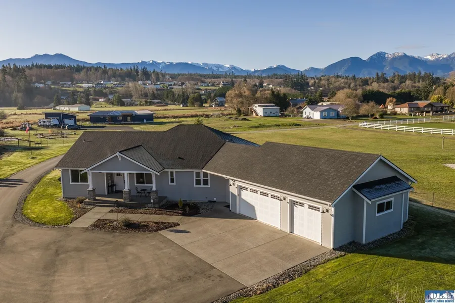 This is it! Country living conveniently located in the desirable Agnew area, only 15 minutes to either Sequim or Port Angeles. This beautiful 2019 custom built home sits on 1.26 acres at the end of a quiet cul-de-sac. Less than a mile to the Olympic Discovery Trail. The interior shines with attention to details, such as a modern open kitchen with a large island that seats 4, farm sink, walk-in pantry, high quality appliances, upgraded exhaust hood, cabinets that extend to ceiling with decorative spacing glass doors, quartz countertops throughout the entire house including the primary bathroom shower walls! Vaulted ceiling, pet-friendly luxury vinyl wide planks flooring throughout, large living room with cozy remote controlled propane fireplace and wall sized windows for viewing Hurricane Ridge and the Olympic Mountains! A split floor plan separates the primary bedroom and its walk-in closet from the guest bedrooms located on the opposite end of the house. Step out of the sunken jetted tub in the primary bathroom onto a thermostat controlled heated tile floor. The laundry room features a designated office space with storage cabinets and quartz countertop as well. Additionally, there is a heated over-sized 3-car attached garage including a workbench with mountain views, 800 sq. ft. detached RV shop (60 amp) with attached carport, paved driveway, full-service RV pad with complete hookups. 11-zone underground sprinkler system with a 1,500-gallon holding tank, dual water sources (PUD/ seasonal Agnew Irrigation District).